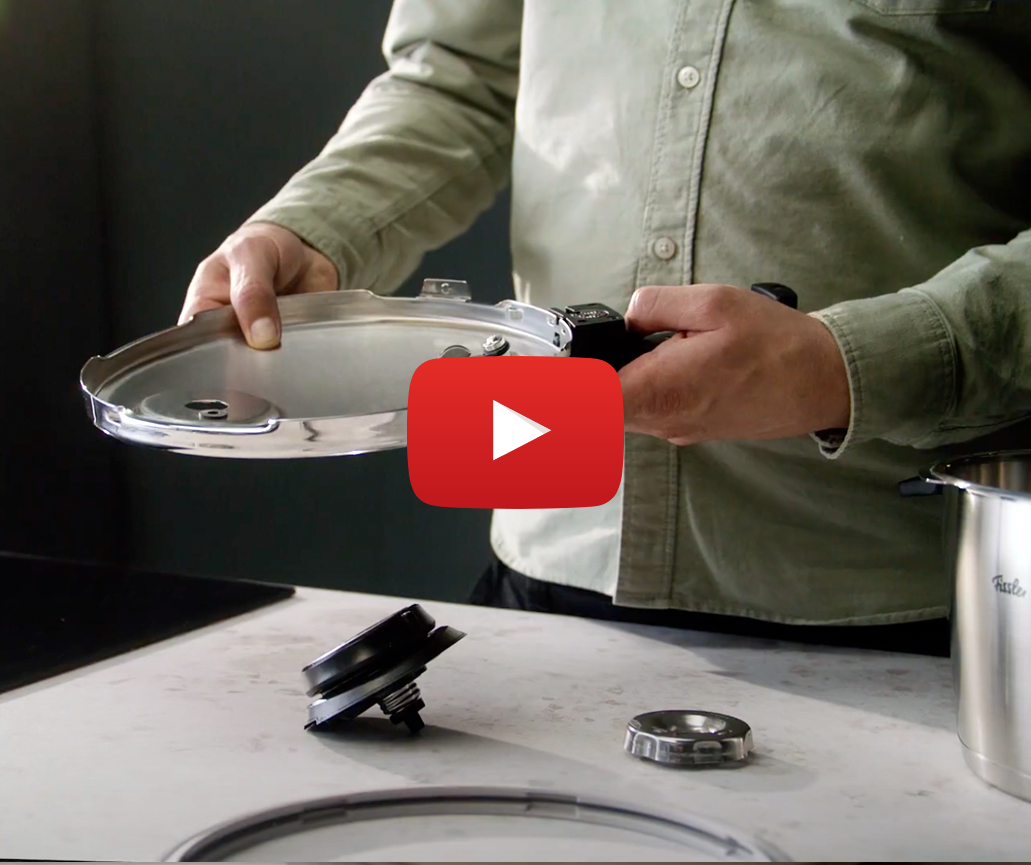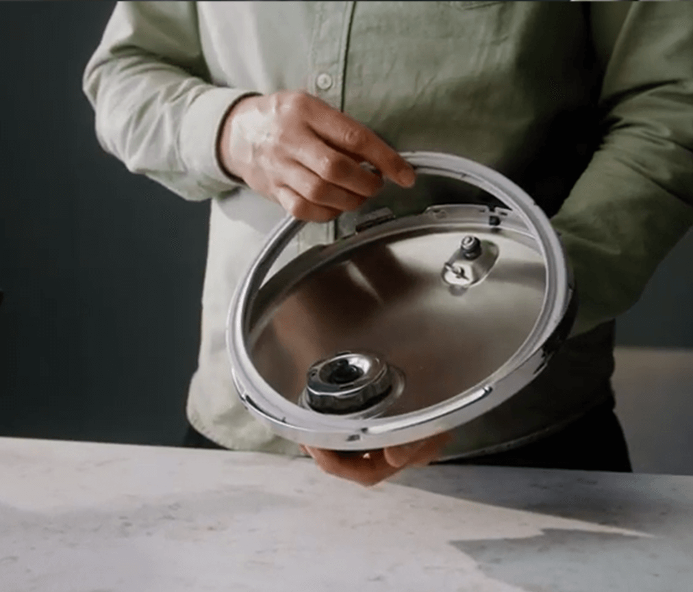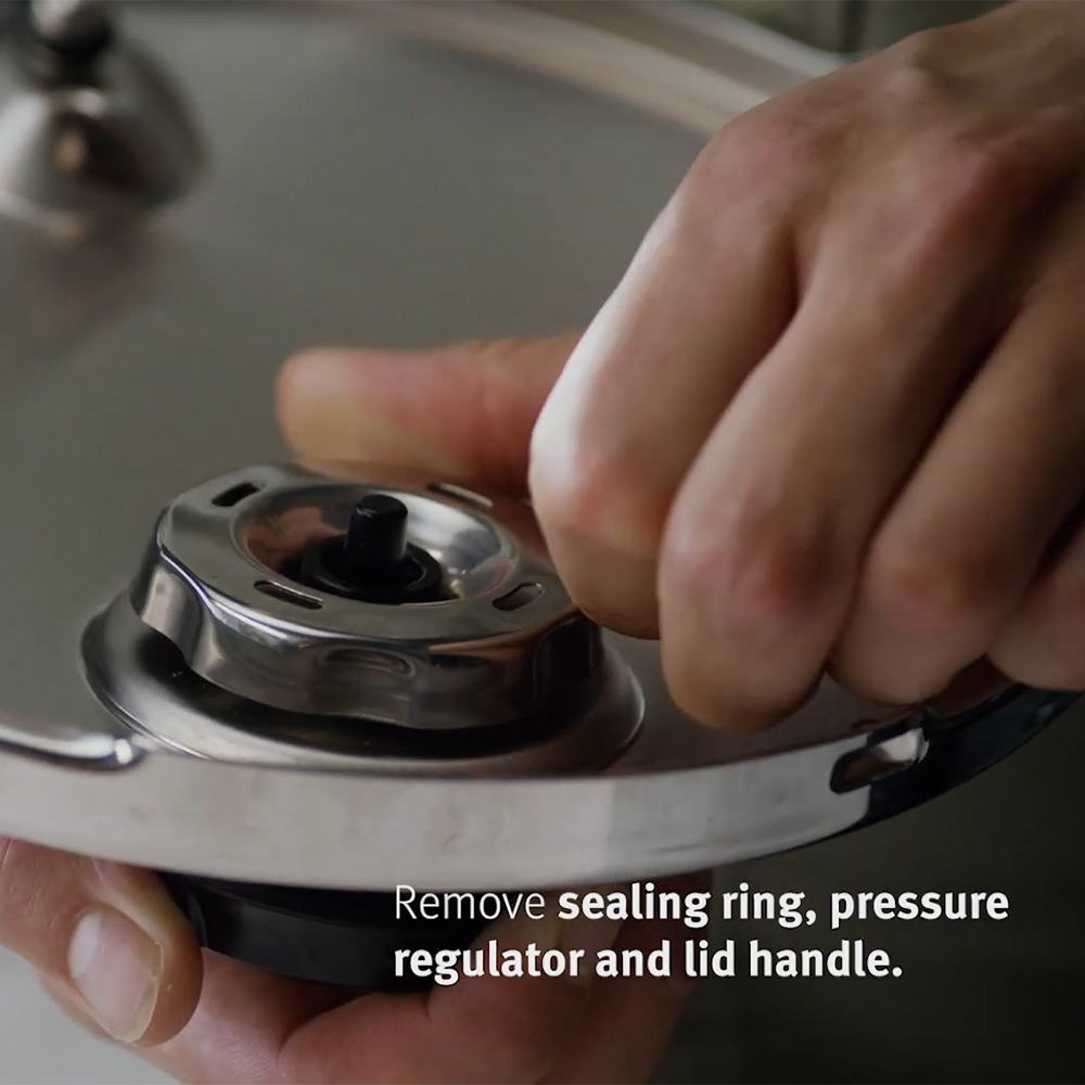 After cleaning, firmly reattach all attachments to the pot. Make sure that the cooking valve seal is tight against the cooking crown all around and that the seal is seated in the notch provided. The sealing ring must also be reinserted in the notch provided.