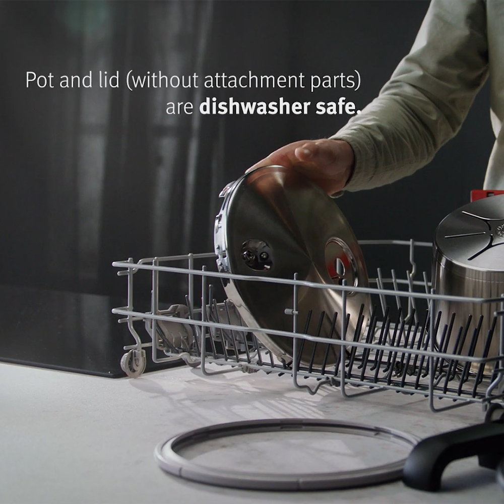 The body of the pot and the lid (without the above attachments) are dishwasher safe.
