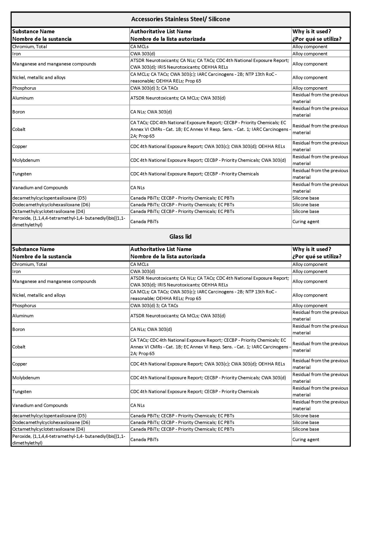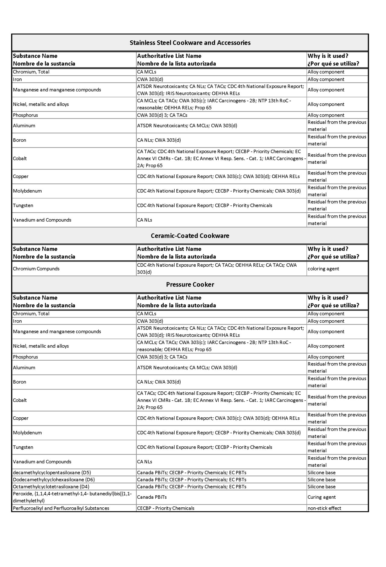 En cumplimiento de la legislación promulgada sobre el derecho a saber, la siguiente información facilita datos a los consumidores sobre los ingredientes utilizados en la fabricación o elaboración de nuestros productos. En Fissler, nos comprometemos a crear productos seguros para nuestros consumidores y las personas para las que cocinan.